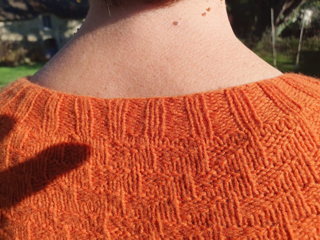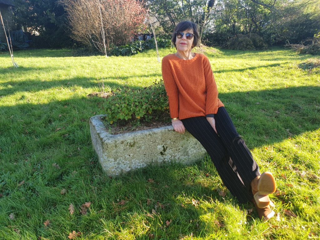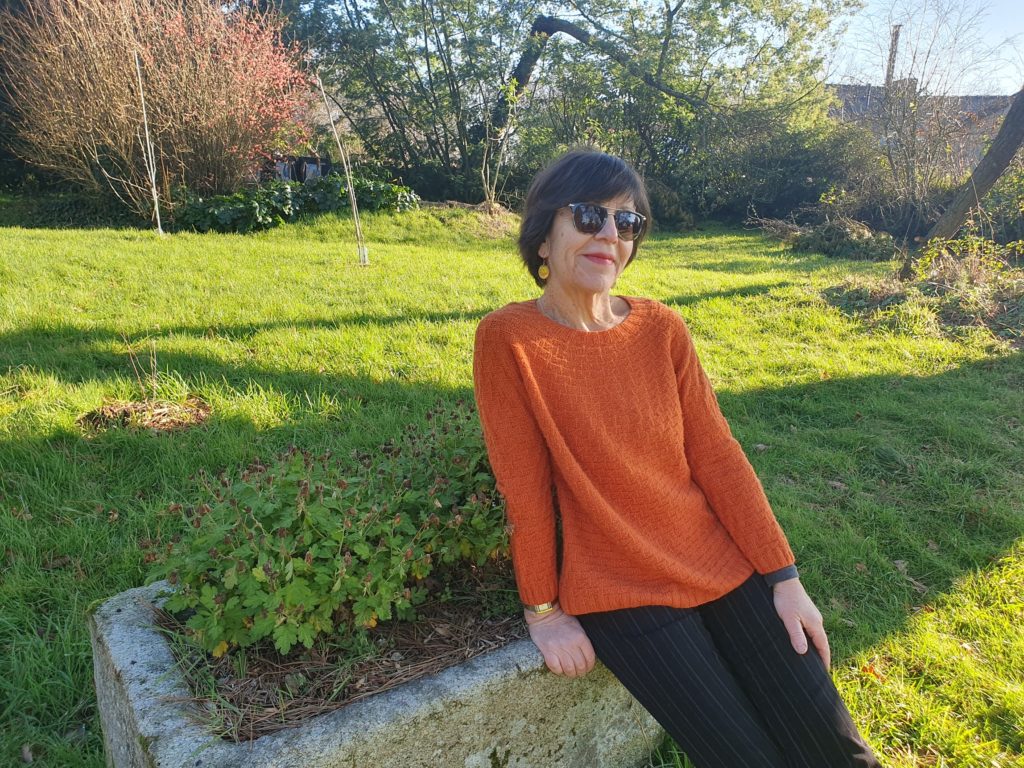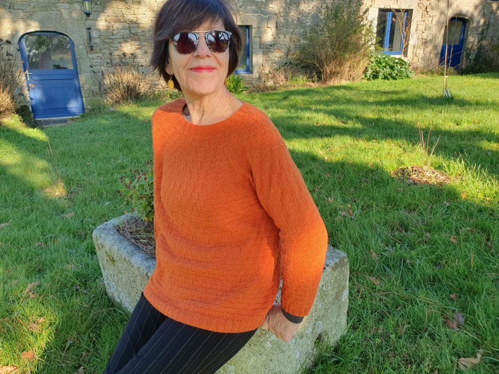 J’ai tenu bon et suis allée jusqu’au bout et finalement je suis contente du résultat, même si ce n’est pas ma réalisation préférée. L’aspect final fait penser à un vêtement « vintage » aux couleurs « passées ». Je le trouve « décalé » par rapport à ma garde-robe et donc un peu difficile à porter, mais les réactions sont positives : mon entourage me dit que le modèle est chouette et qu’il me va bien, tant mieux !