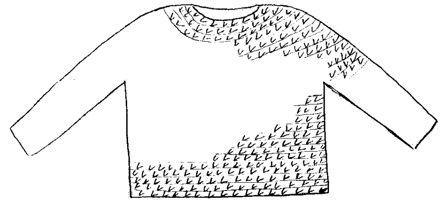 Le pull est tricoté sans couture ; en rond du haut en bas jusqu’aux emmanchures puis le dos et le devant séparément jusqu’aux épaules. Les épaules sont assemblées et on relève les mailles autour de l’emmanchure pour tricoter les manches en rond jusqu’aux poignets. Enfin, on relève des mailles sur l’encolure pour la bordure en côtes.